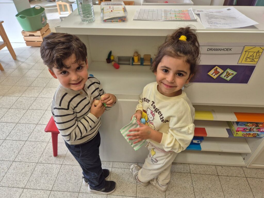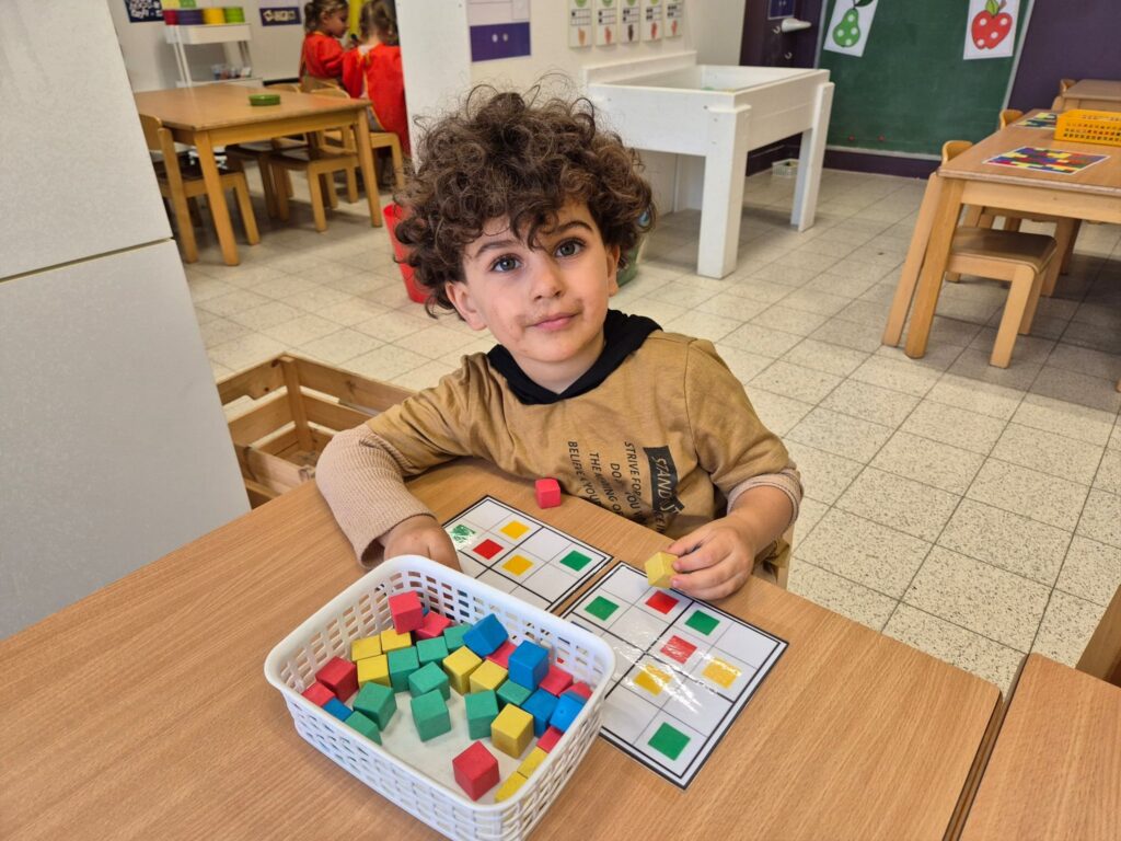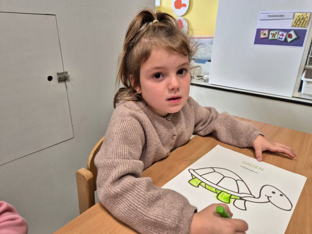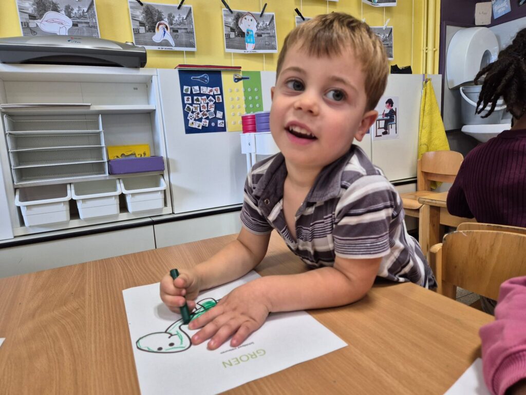 De afgelopen weken werkten we rond het thema “kleuren”. Samen gingen we op zoek naar kleuren in de klas en op de speelplaats. Elke dag kozen we één kleur en mochten de kinderen die kleur als kledij aandoen – dat zorgde voor veel enthousiasme!